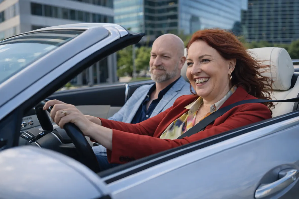 No, we don't spend our days driving round in fancy cars. This image was generated by AI.